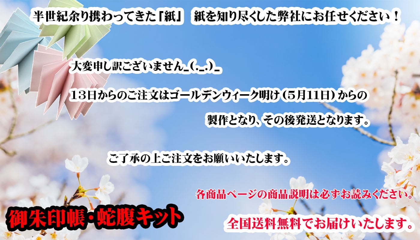 ITEM LIST Home 見開きサイズ 見開きサイズ 「雪の結晶」和紙 御朱印帳キット ¥1,100 「招き猫柄」和紙 御朱印帳キット ¥1,100 「金魚柄」和紙 御朱印帳キット ¥1,100 「子蝶々柄」和紙 御朱印帳キット ¥1,100 見開き 生成りor白 ボール3冊セット ¥4,500 見開きピンク・ブルー・若草の3冊ボールセット ¥4,500 見開きサイズ・パステル同色3冊ボールセット ¥4,500 見開きサイズ 蛇腹本文のみ10冊セット ¥12,000 見開きサイズ10冊ボールセット ¥13,000 招き猫柄『大判・見開き』御朱印帳 ¥2,400 金魚柄和紙『大判・見開き』御朱印帳 ¥2,400 御朱印帳 鳳凰生地(きなり・白) ¥2,200 子蝶々『大判・見開き』御朱印帳 ¥2,400 MORE 1 2